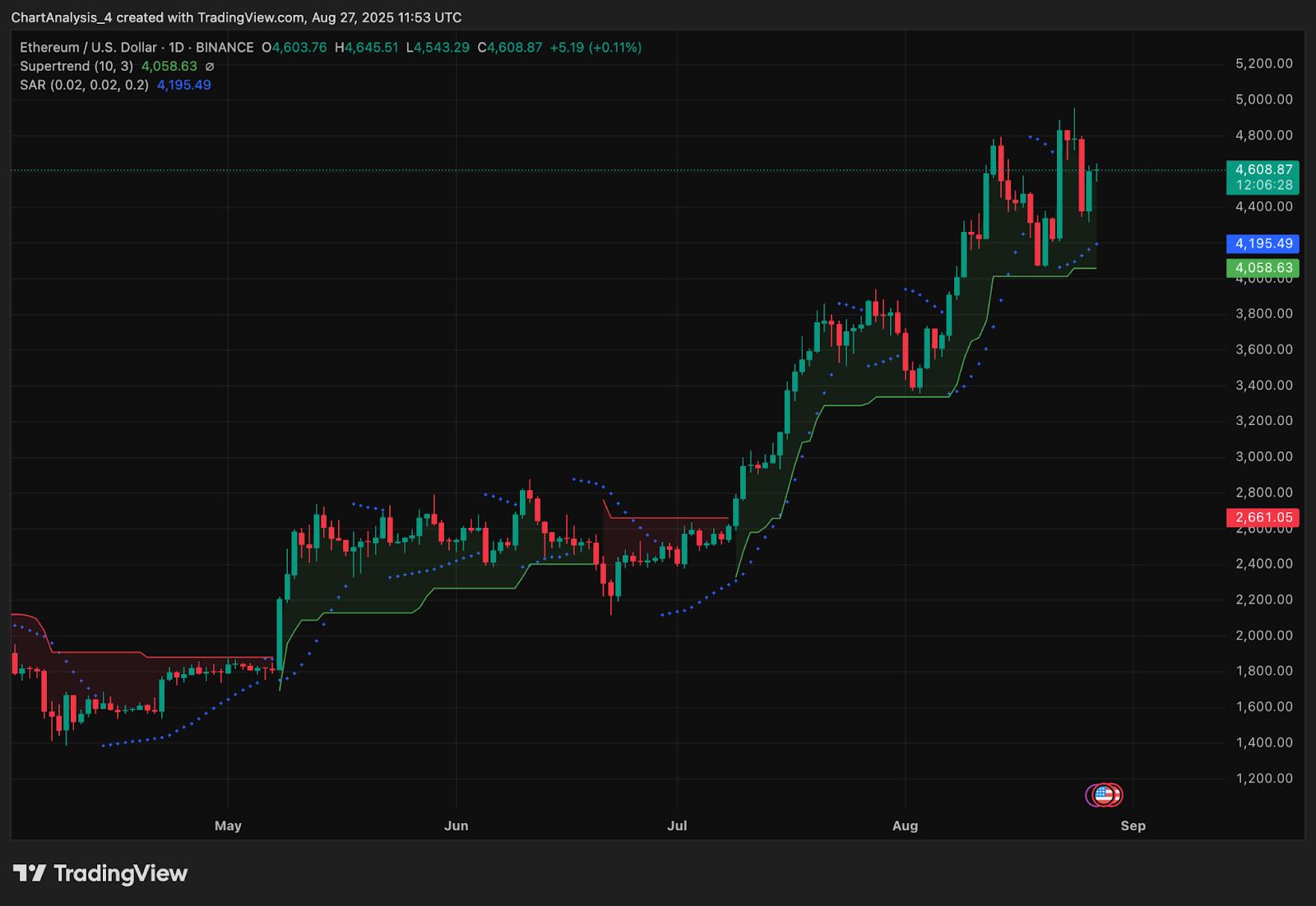 然而,看跌者指出,4,800 美元的反复跌破可能形成双顶形态。跌破 4,400 美元将使看涨结构失效,并打开通往 4,200 美元的道路,更深的支撑位位于 4,050-4,100 美元,与每日超级趋势线重合。