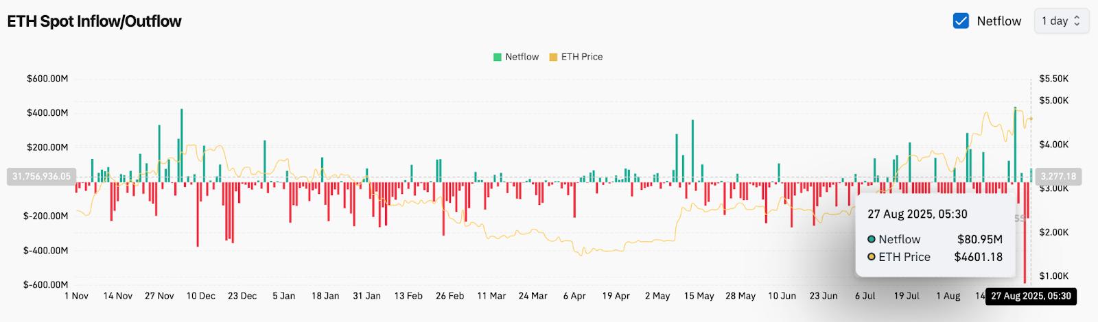 链上数据已转为利好。Coinglass 报告称,8 月 27 日 ETH 净流入量为 8095 万美元,这是连续数周资金流出后首次出现显著增长。这一逆转暗示大型投资者正在重新吸金。