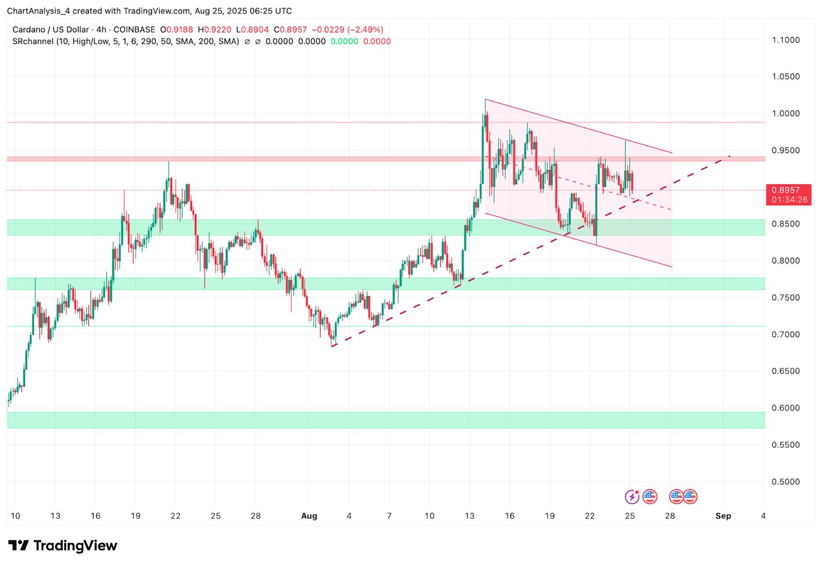 ADA 在 4 小时图上呈现下行通道走势。本周价格两次触及 0.95 美元附近的上边界后,回落至通道中线。日线图显示 0.97 美元处有一个清晰的水平线,这是自 7 月以来的波动高点,目前仍在充当供应。成交量曲线显示,在价格下方 0.88 美元至 0.92 美元的区间内,市场接受度较高。这解释了该区域波动的持续性。