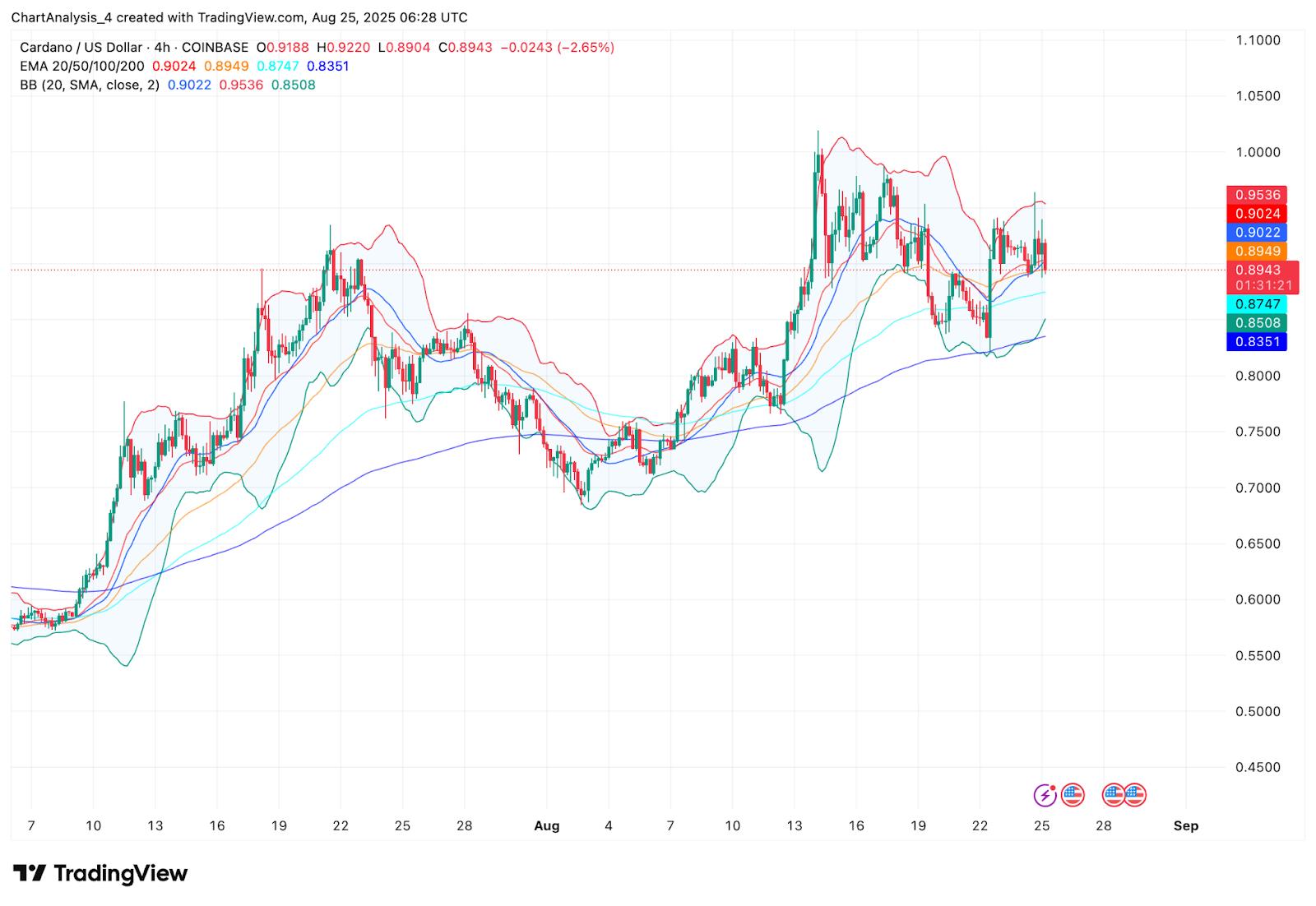 指数移动平均线 (EMA) 和波动区间定义了日内走势图。在 4 小时图上,20 日指数移动平均线 (EMA) 位于 0.90 美元附近,50 日指数移动平均线 (EMA) 位于 0.895 美元附近,100 日指数移动平均线 (EMA) 位于 0.875 美元附近,200 日指数移动平均线 (EMA) 位于 0.835 美元附近。目前价格低于 20 日指数移动平均线,跨越 50 日指数移动平均线,并轻松高于 100 日和 200 日均线,这表明在仍然看涨的大趋势中,短期内市场表现疲软。布林带构成了区间,中轨位于 0.90 美元附近,上轨位于 0.954 美元附近,下轨位于 0.851 美元附近,使 ADA 价格保持在 0.85 美元至 0.95 美元区间内。