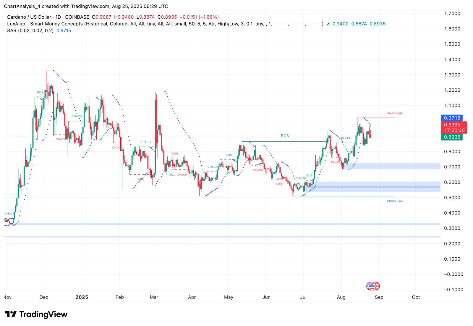 Smart Money Concepts 在日线图上将近期局部高点视为7月看涨结构突破后的弱势高点。在ADA坚定突破0.97美元之前,进入该区域的反弹很可能遭遇供需缺口。