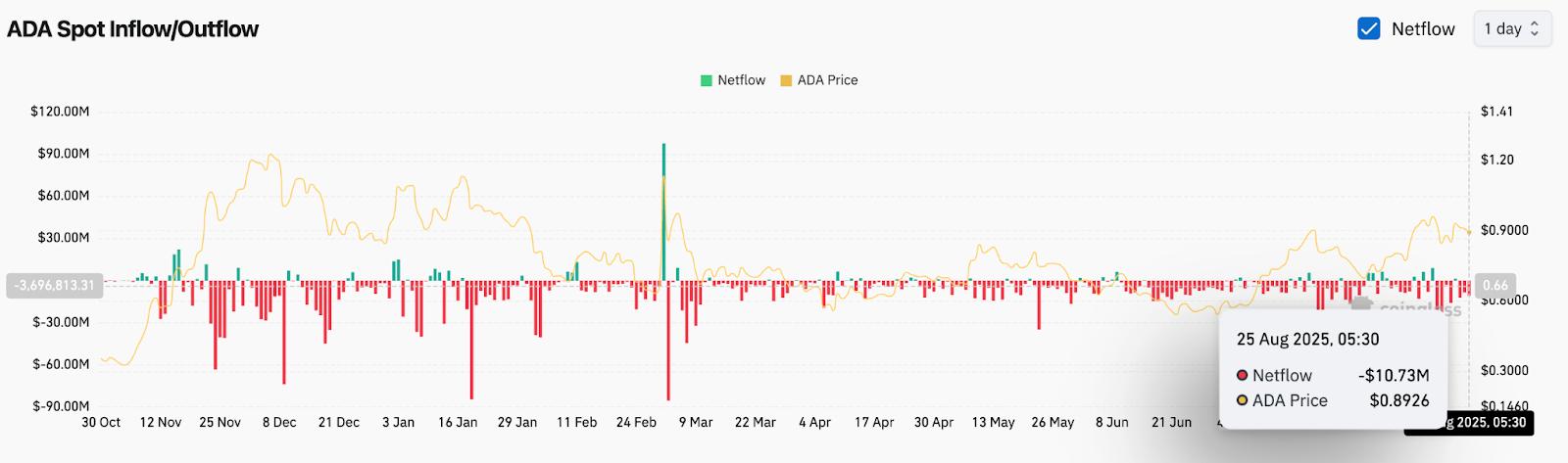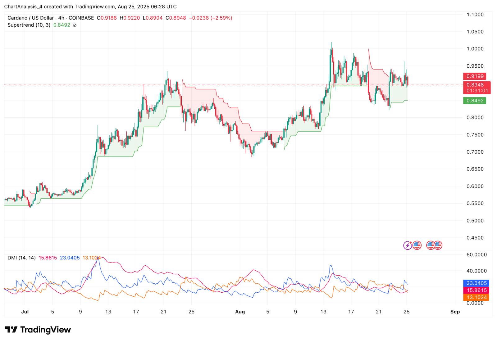 卡尔达诺价格今日下跌的原因在于通道顶部的供应量以及现货资金的疲软。Coinglass 8 月 25 日的现货数据显示,净流出量约为 1073 万美元,而 ADA 的交易价格约为 0.89 美元,这表明投资者获利了结,而非新增持仓。日线图上,抛物线转向指标 (SAR) 位于价格上方 0.97 美元附近,与 0.97 美元的水平上限一致,并强化了买家近期的防御立场。
