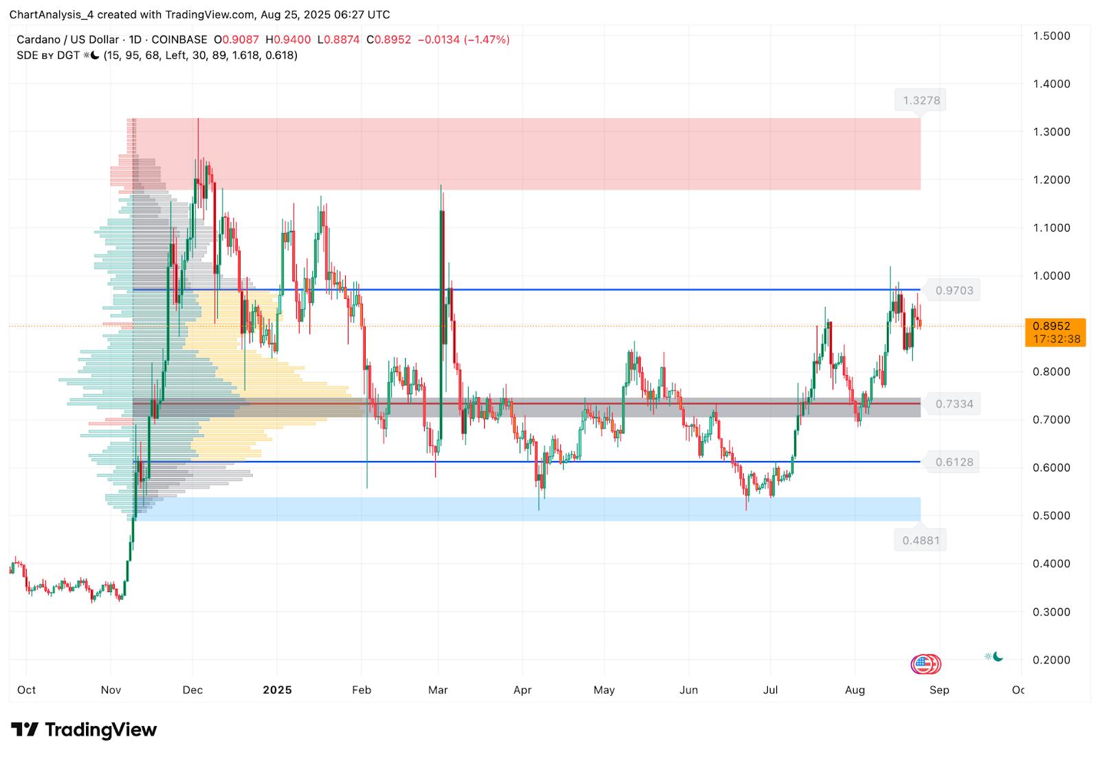 这一数据与下行通道内的价格走势以及 0.90 美元附近的价值集群相吻合。日成交量曲线突显出 0.733 美元和 0.613 美元的更深支撑位,而 1.20 美元上方存在广泛的供应障碍,除非 ADA 首先突破 0.97 美元至 1.00 美元的区间,否则该障碍仍难以触及。