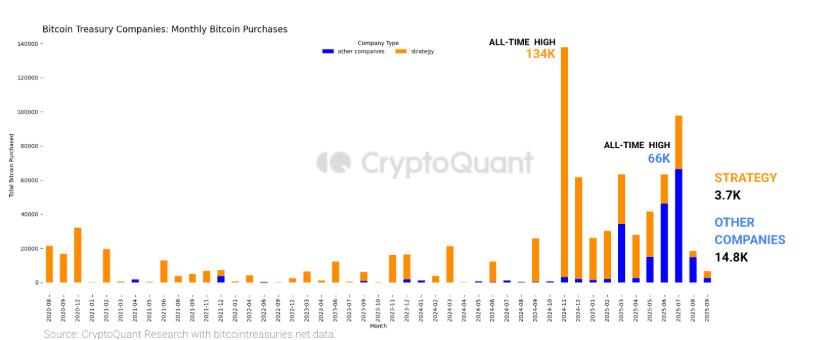 与此同时,比特币国库持有量今年达到了84万BTC的新高,其中Strategy基金占比超过四分之三。然而,积累速度增速急剧放缓。Strategy 8 月份的平均月增长率仅为 5%,而 2024 年底为 44%,其他公司 8 月份的增长率仅为 8%,而 3 月份的增长率为 163%。