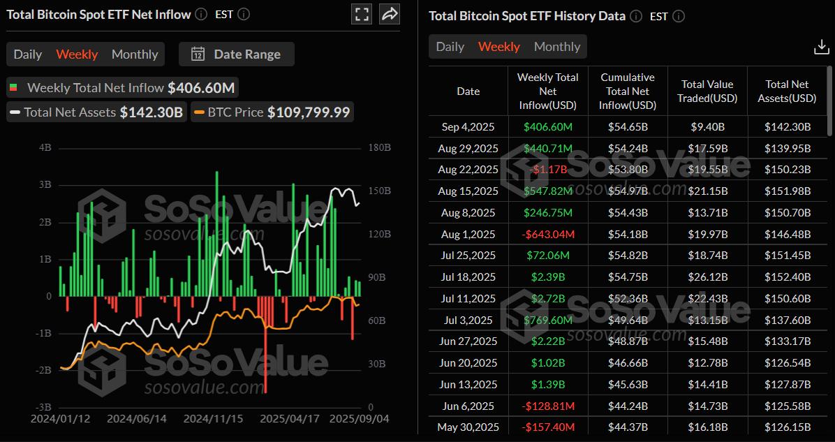 本周迄今为止,比特币价格的回升得到了机构和企业投资者的支持。以下 SoSoValue 数据显示,截至周四,比特币现货交易所交易基金 (ETF) 本周迄今共录得 4.066 亿美元的资金流入,连续第二周保持正流入。然而,与 7 月中旬 BTC 首次突破 12 万美元大关时相比,本周的流入量有所下降。