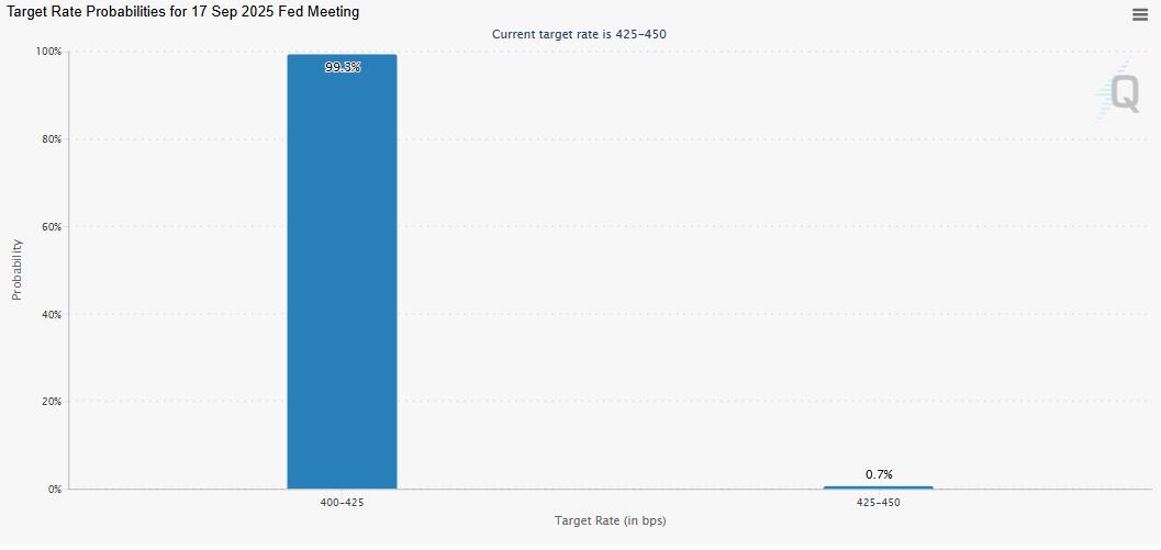 如下图所示,芝商所的FedWatch工具显示,美联储在9月会议上降息25个基点(bps)的可能性为99.3%。美联储降息预期可能会对美元(USD)造成压力,并提振风险偏好情绪,从而支撑BTC等风险较高资产的复苏。此外,市场参与者预计,到2025年底,央行将至少降息两次,这可能会进一步推高BTC等风险较高资产的价格。