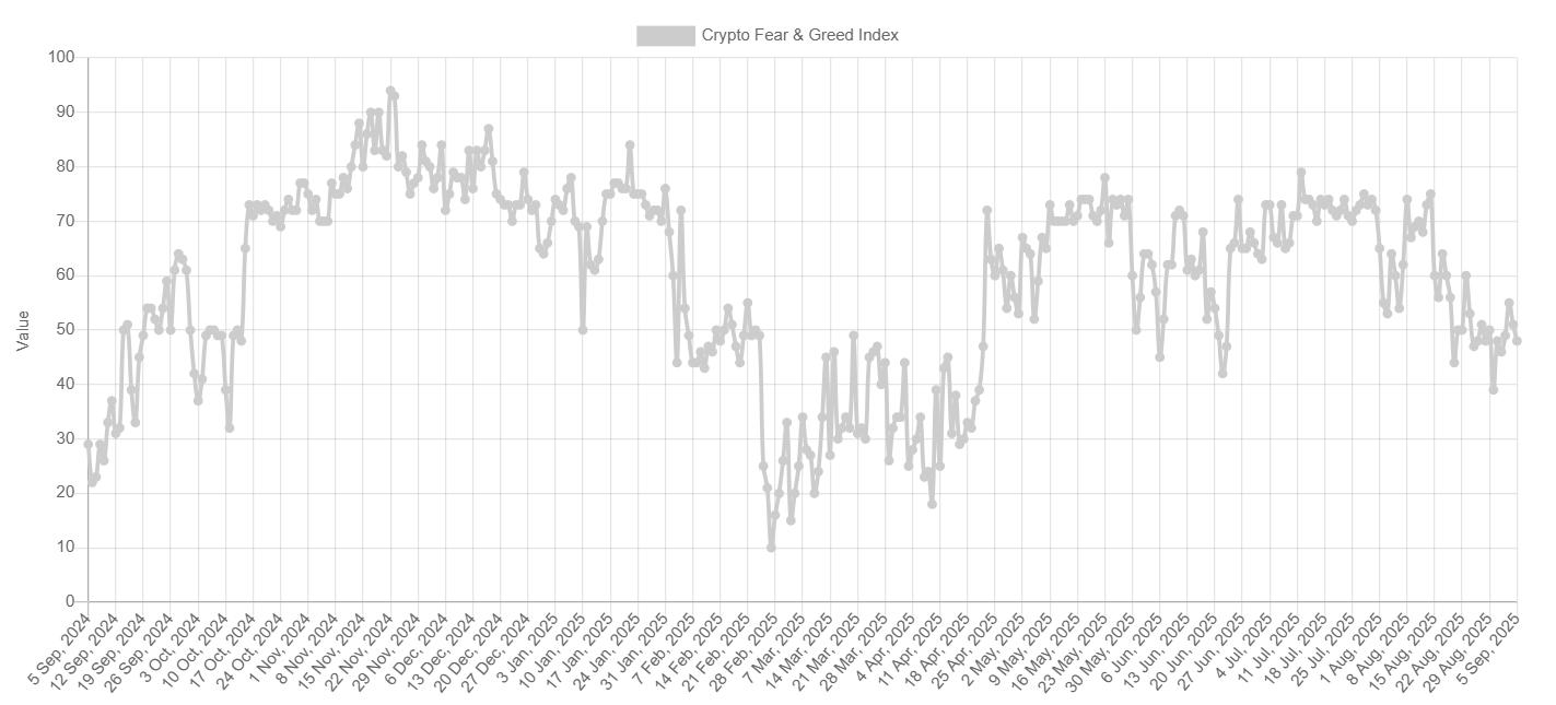 加密货币恐惧与贪婪指数指标衡量的是加密货币市场,本周已回升至 48,反映出中性情绪,并暗示看跌压力可能正在缓解。