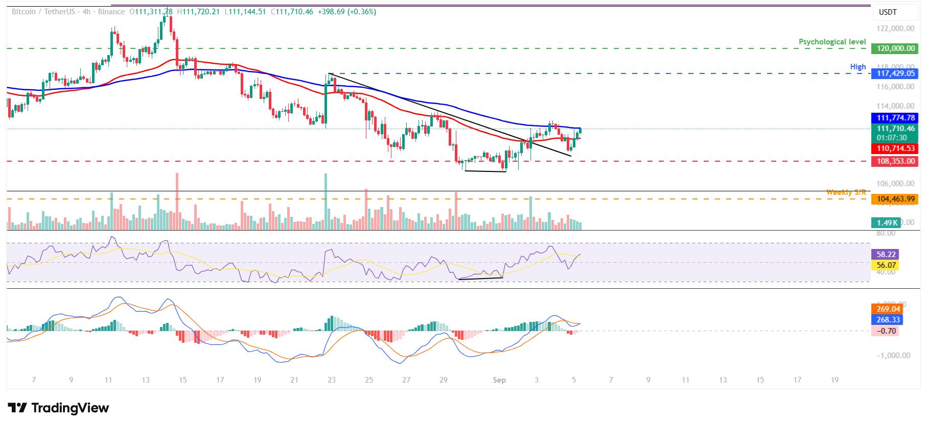 BTC 周二突破了一条下降趋势线(由 8 月 22 日以来 4 小时图上的多个高点连接而成)。周四,BTC 大致重新测试了这条趋势线,目前正在反弹,周五交易价接近 112,000 美元。