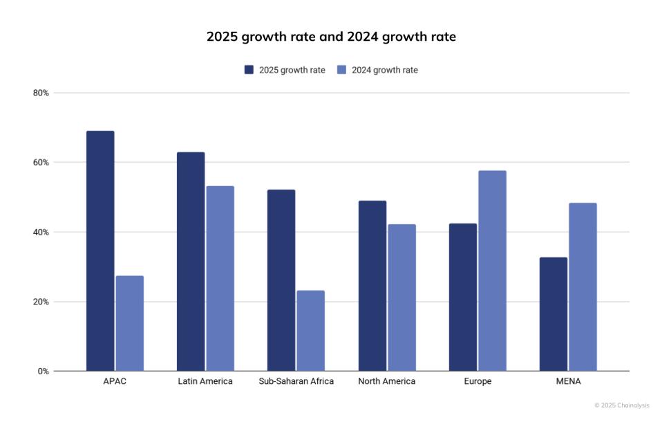 亚太地区 (APAC) 的链上加密交易同比增长 69%,主要由印度、越南和巴基斯坦推动,而拉丁美洲紧随其后,增长率为 63%。