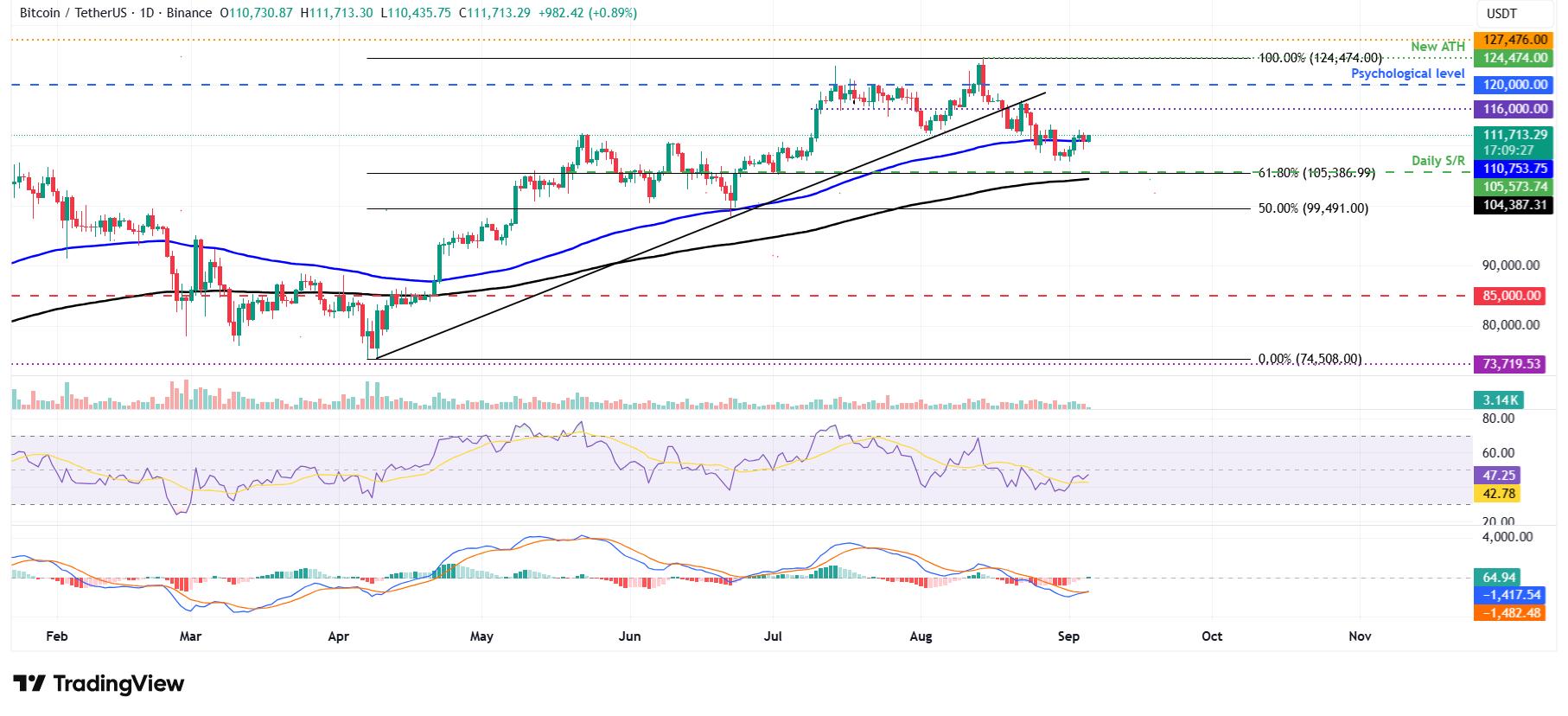 日线图上,BTC 周二收于 100 日指数移动平均线 (EMA) 上方,报 110,753 美元,尽管周四面临压力,但整个星期都保持在这一动态支撑位之上。