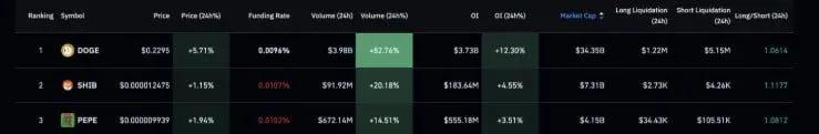 市场信息显示,通过衍生品市场,机构投资者对模因代币的吸引力日益增强。狗狗币(DOGE)的未平仓合约上涨了12.3%,SHIB和PEPE的未平仓合约分别上涨了4%和3%。这些资产的交易量均实现了两位数的百分比增长,表明市场参与度有所提升。