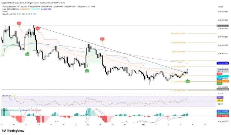 Pepe 同样表现出强劲势头,在周一交易中反弹超过 1%。这款青蛙主题代币突破了阻力趋势线,收复了 0.00001001 美元的水平,超过了超级趋势线和 100 周期 EMA。