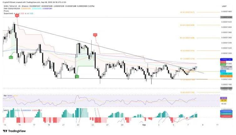 Shiba Inu 在四小时图上突破了多个下跌三角形。该代币目前的交易价格高于其 100 周期指数移动平均线,为 0.00001244 美元,标志着趋势可能出现逆转。