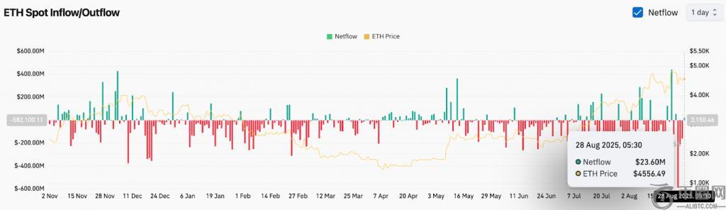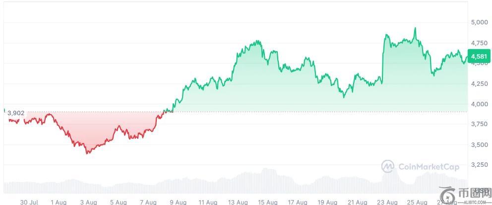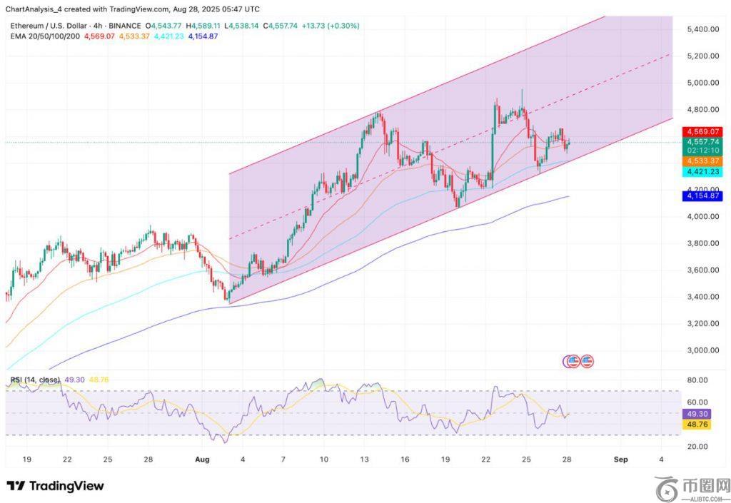 市场数据显示,8 月 28 日净流入 2360 万美元,这支持了以太坊机构采用的论调。关键阻力位在 4,800 美元,成功突破后,以太坊或将触及 6,000 美元的目标区域。