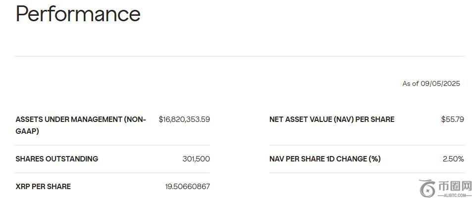 截至 9 月 5 日,资产净值较前一交易日飙升 2.50%。灰度数据显示,该公司已向信托投资者发行约 301,500 股,每股约相当于 19.5 个 XRP。截至发稿时,该信托的资产管理规模为 1682 万美元。