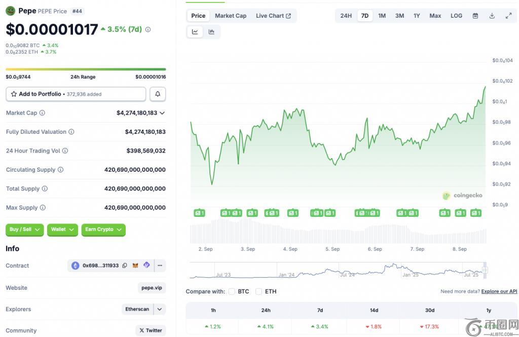 今天(2025 年 9 月 8 日),Pepe(PEPE)正在经历一场相当大的反弹。根据 CoinGecko 统计,青蛙主题的 memecoin 在过去 24 小时内上涨了 4.1%。较前一周上涨了3.4%。另一方面,比特币(BTC)同期分别上涨了0.8%和2.1%。PEPE的[飙升]正值其他模因币(memecoin)也经历了类似的飙升。Bonk(BONK)在过去24小时内上涨了9.2%,在过去一周上涨了2.9%。狗狗币(DOGE)在日线图上上涨了7.7%,在周线图上上涨了6.9%。让我们来讨论一下今天推动模因币价格上涨的因素。