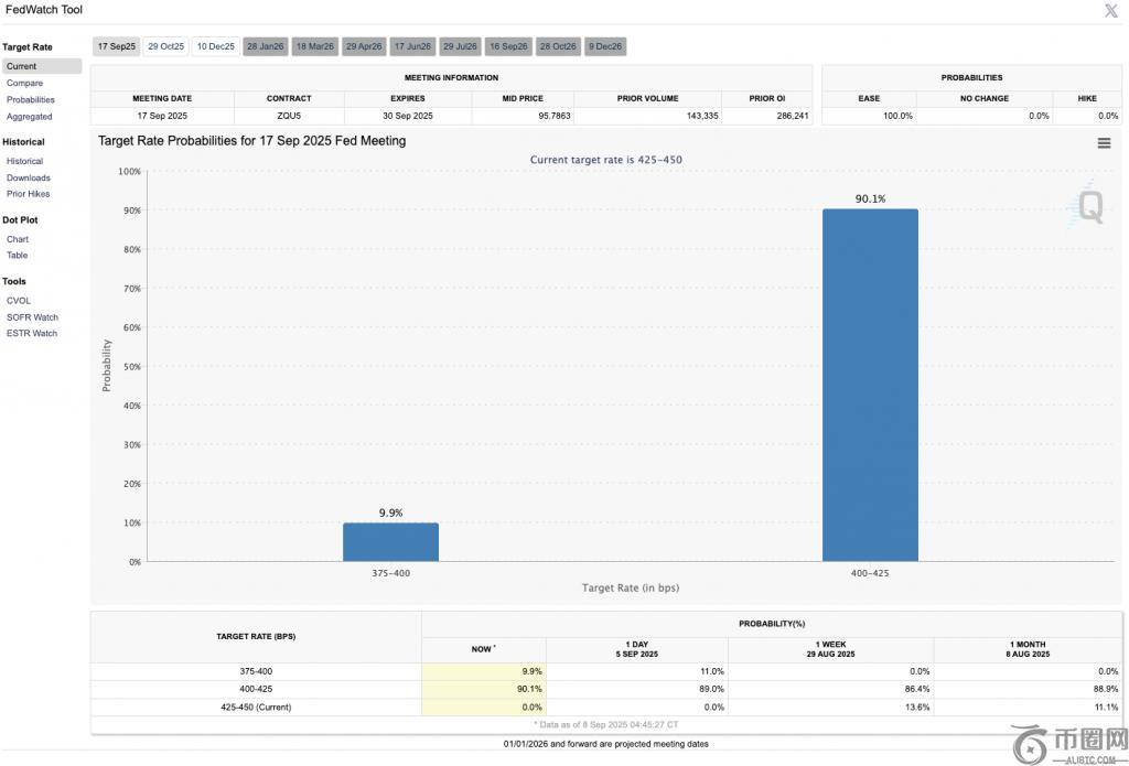 PEPE 的最新上涨可能是由于本月晚些时候降息的可能性很高。随着借贷变得更加容易,降息可能会导致更多投资者进行高风险押注。利率下降常常导致诸如 PEPE 之类的 memecoin 和加密货币市场飙升。投资者可能在美联储下次会议前就已消化降息的影响。CME FedWatch 工具显示本月降息的可能性为 100%降息25个基点的可能性为90.1%,降息50个基点的可能性为9.9%。