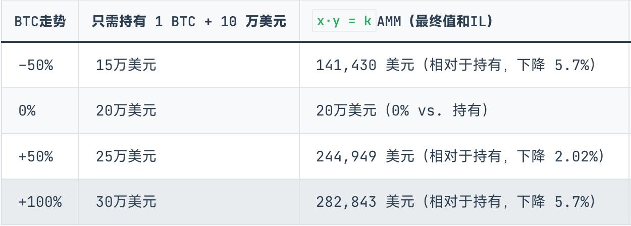 无偿损失从整个链上经济系统的视角而言,可以视为一种“期望”,LP 选择了提供流动性,就不能再要求获得持有的收益,所以,本质上无偿损失更多是一种“会计”式的记账损失,而不应该被作为一种真实的经济损失,相比于持有 BTC,LP 也可以获得手续费。