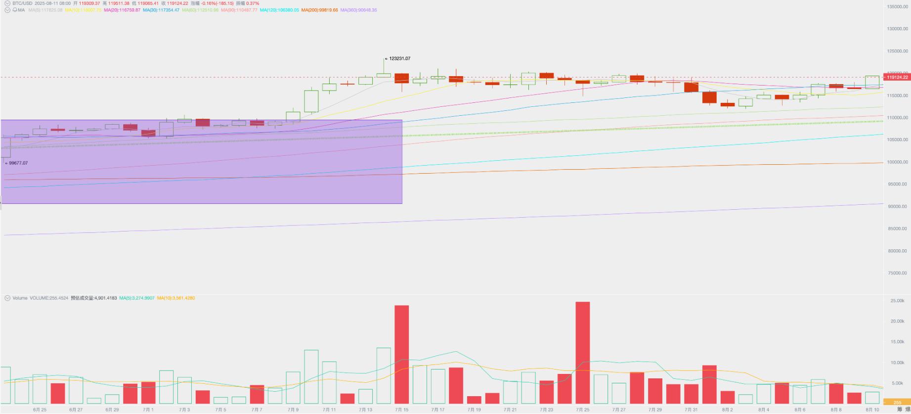 BTC 本周开于 114215.70 美元,收于 119309.37 美元,最低 112622.14 美元,最高 119324.08 美元,涨幅 4.46%,振幅 5.97%,成交量有所萎缩。