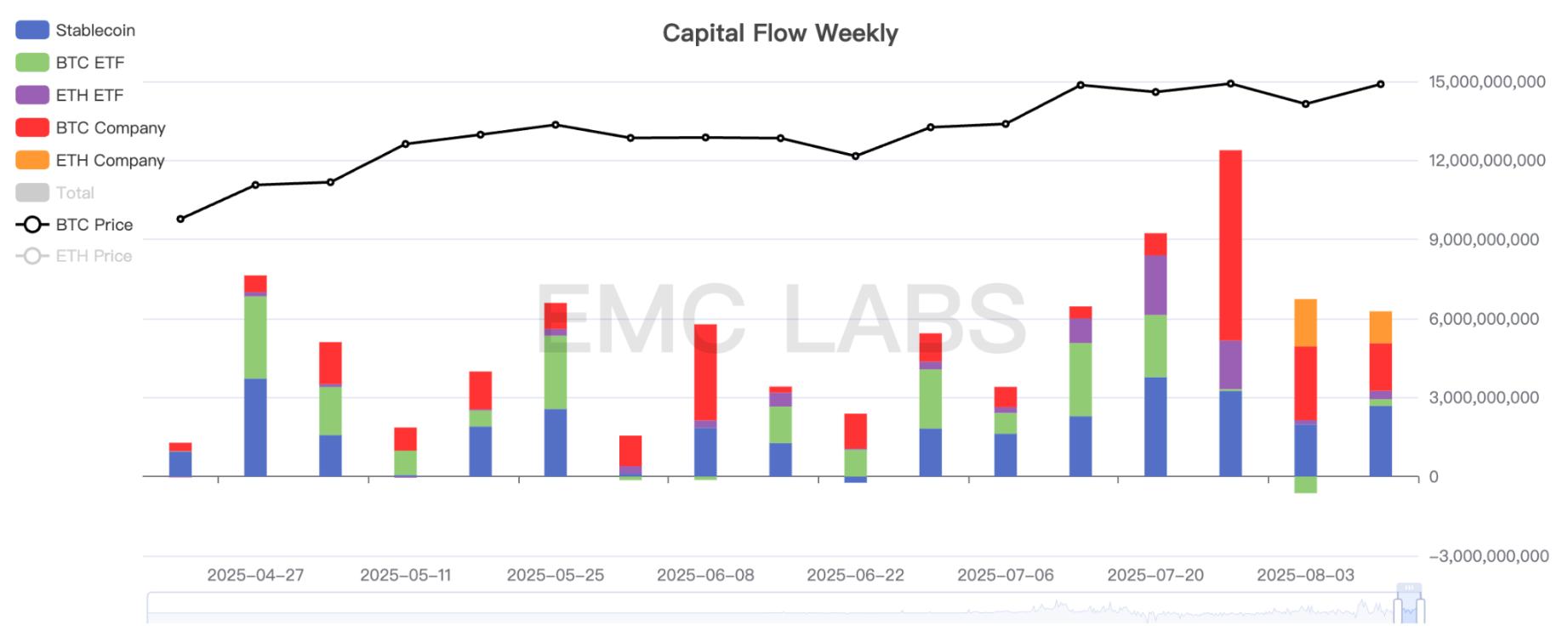 本周,全市场资金流入规模达到 61.72 亿美元,略高于上周的 61.04 亿,其中稳定币通道 25.82 亿,BTC Spot ETF 通道 2.57 亿,BTC 企业购买 18.07 亿,ETH Spot ETF 通道 3.21 亿,ETH 企业购买 12.06 亿。