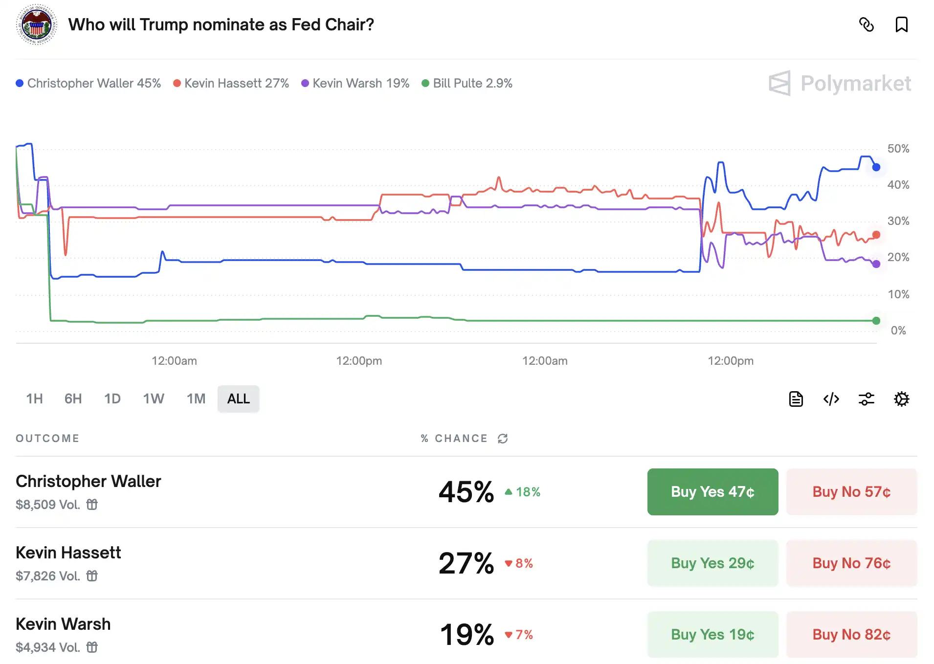 目前在去中心化预测市场 Polymarket 上,三位候选人的赔率差距正在逐步拉开:沃勒支持率已升至 45%,领先哈塞特(27%)与沃尔什(19%),市场似乎正在押注这位「熟悉规则、立场鸽派」的现任理事,可能是特朗普最放心的继任者。同样值得注意的是,新提名美联储理事米兰也格外称赞了沃勒,认为其是鲍威尔后合适的美联储主席人选。