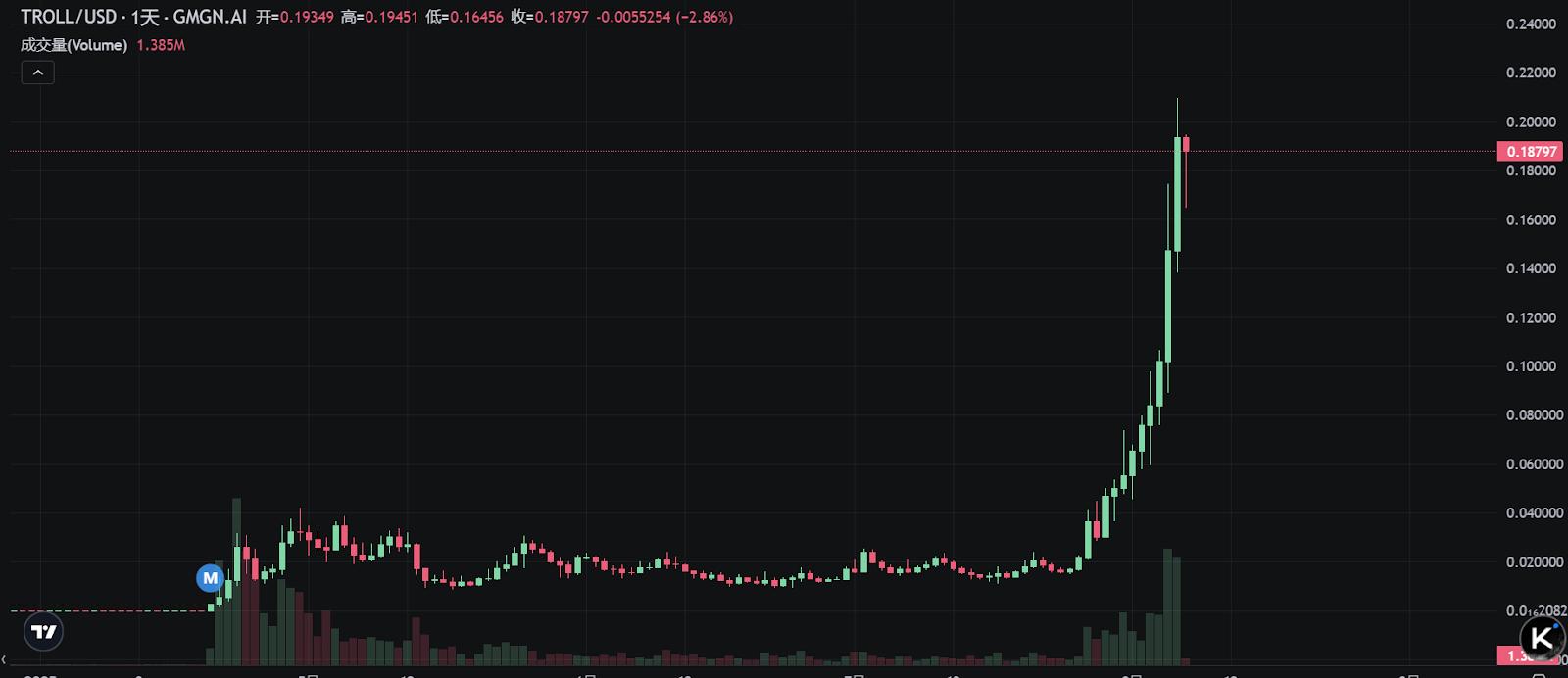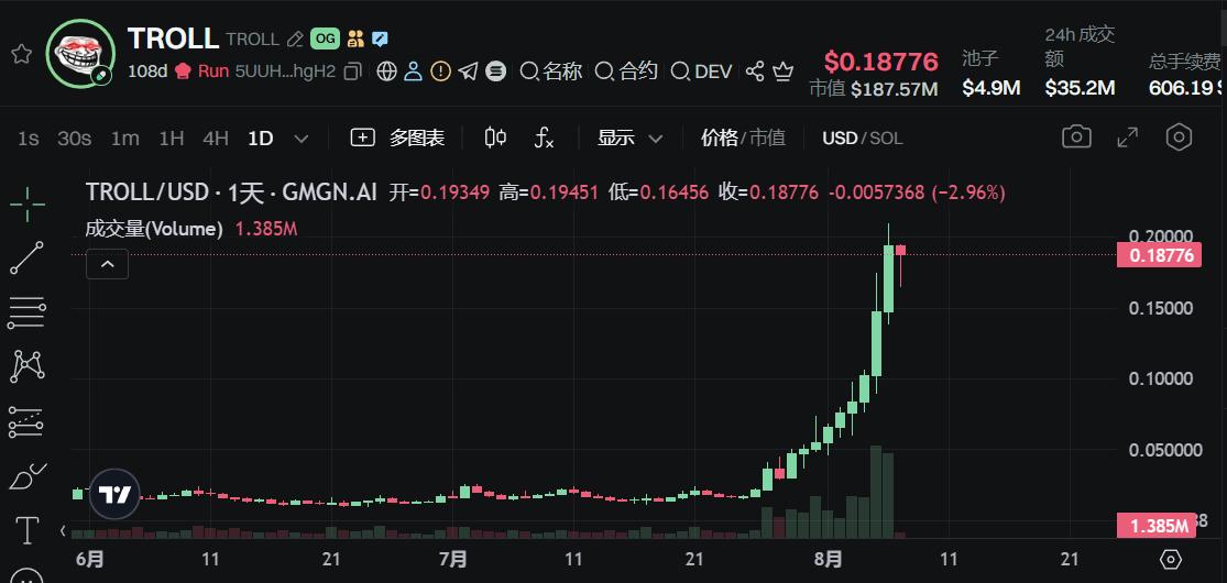 • ​​价格曲线垂直拉升​​:7月25日至8月7日期间,TROLL实现12倍涨幅,市值从1612万美元暴涨至1.84亿美元,突破关键心理关口