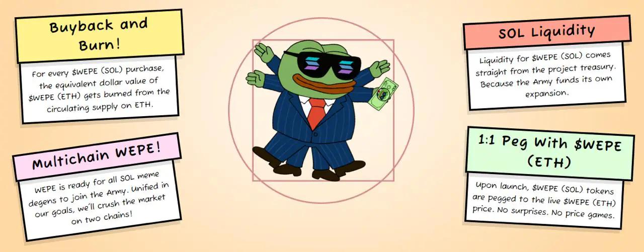 作为 $WEPE 迁移至 Solana 的一部分,以太坊上的代币供应量将以 1:1 的比例销毁,以维持两个网络之间的价值平价。此回购方案确保 $WEPE 成为真正的多链代币,而不会降低以太坊持有者原始 $WEPE 投资的价值。