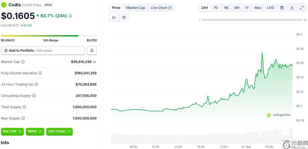 CUDIS 加密货币在 24 小时内暴涨近 60%,在 Coinbase 新上市后攀升至 0.179 美元,引发了大量零售和机构需求。