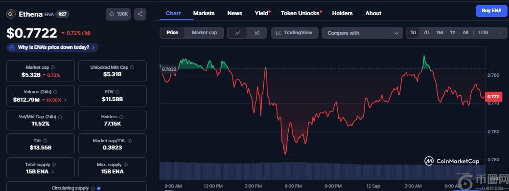 在过去一天小幅下跌之后,Ethena 的原生代币交易价格为 0.7720 美元。