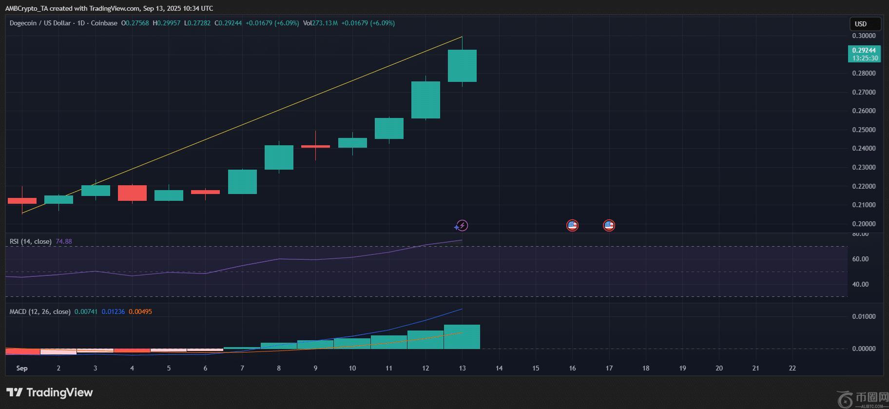 不过,狗狗币本身似乎并不担心。过去一周,DOGE 已上涨36%,从 0.21 美元攀升至接近 0.30 美元。