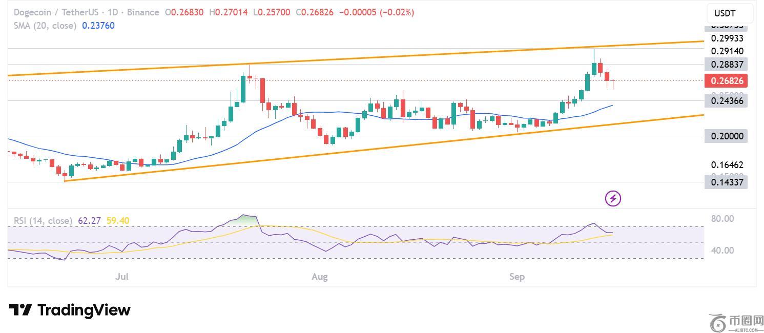 狗狗币目前的市场价格为 0.26 美元(24 小时内变化为 -0.05%),近期触及 0.30 美元的既定阻力区上趋势线后开始回落。