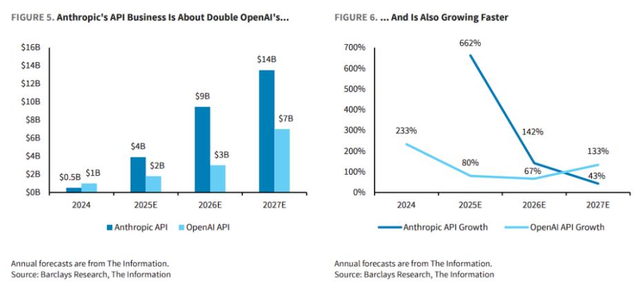 Anthropic 的 API 业务 2024 年实现 5.12 亿美元收入,预计 2025 年将激增至 39.07 亿美元,同比增长 662%。相比之下,OpenAI 的 API 业务 2024 年收入为 10 亿美元,2025 年预计增长至 18 亿美元,增速为 80%。