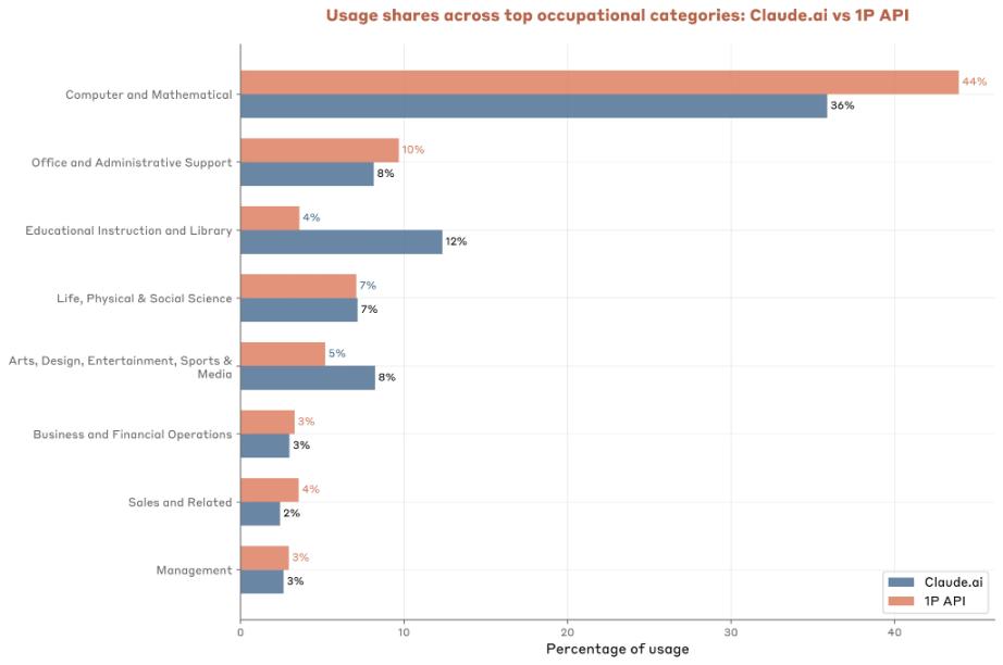 在任务分布上,Claude 的 API 客户将 44% 的使用集中在计算机和数学类任务,远高于 Claude.ai 平台的 36%。同时,办公和行政管理类任务占比约 10%,体现了企业对自动化办公需求的旺盛。企业还将 Claude 部署于营销材料创建和商业招聘数据处理等领域。