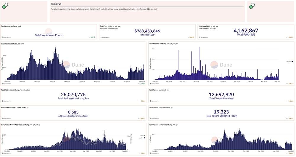 24小时7天1年 值得注意的是,Solana 2025 年发行的代币中,85% 都是 memecoin,大部分是在 pump.fun 上发行的。根据 沙丘 的数据,已有超过 1200 万个代币在 pump.fun 上发行。