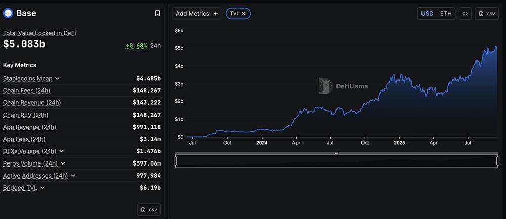 据 DeFiLlama 称,Base 的 TVL 已上涨 5%,达到 50 多亿美元,这主要得益于 Toshi 加密货币的炒作日益高涨。