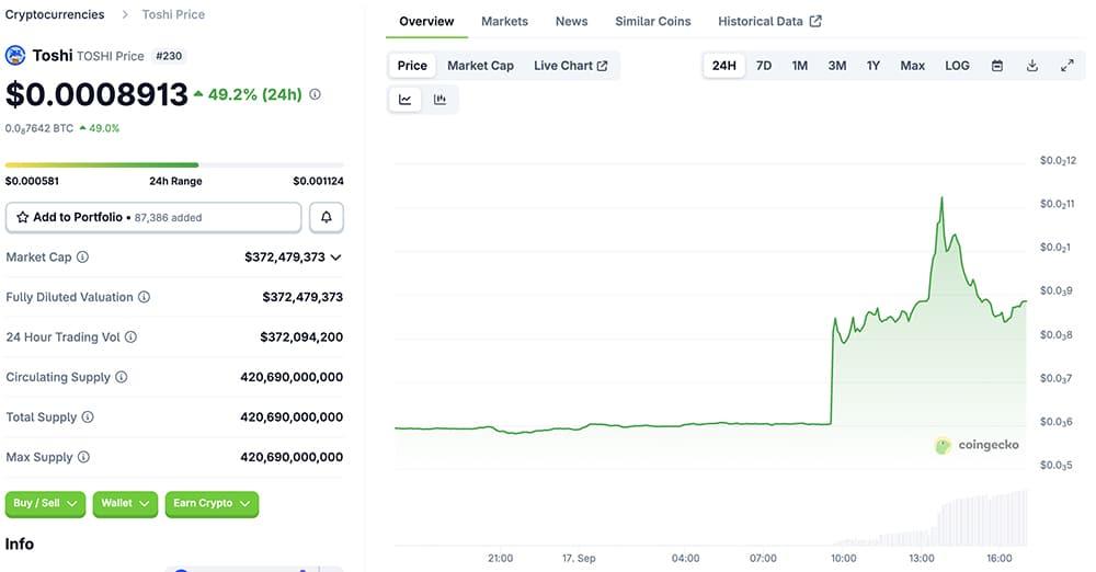 Toshi 加密货币目前交易价格约为 0.00088 美元,市值超过 3.66 亿美元,正在碾压 BRETT 等竞争对手,同时提振了整个 Solana memecoin 领域的信心。在韩国 Upbit 上市的推动下,Toshi 的日交易量飙升至 3.63 亿美元以上,Solana 的链上活动也日益升温,显然 memecoin 市场正在迎来夏季。