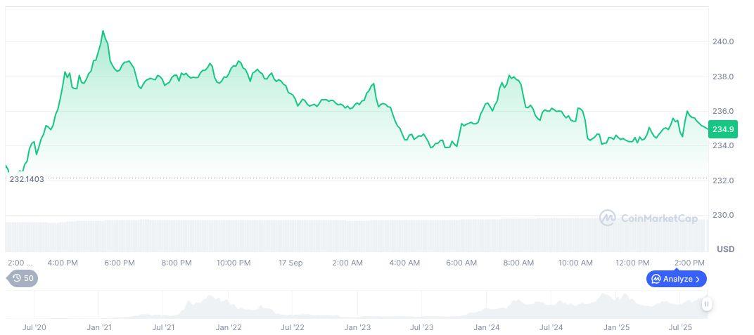 根据 CoinMarketCap 的数据,Solana(SOL)交易价格为 237.10 美元,市值为 1287.5 亿美元。该加密货币的价格在 90 天内上涨了 62.99%,最近 24 小时交易量为 92.9 亿美元。交易活动激增 25.27%。