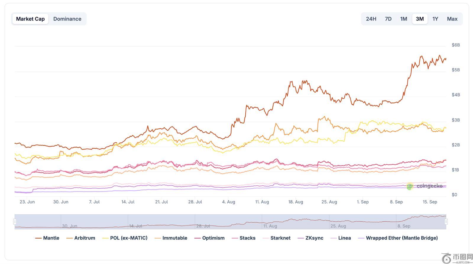 表面上看,这听起来可能相当可观,但与 Layer-2 代币相比,这简直微不足道。以太坊领先的 Layer-2 代币估值数十亿美元——Mantle (MNT) 估值约 55 亿美元,Arbitrum (ARB) 估值 27 亿美元,Optimism (OP) 估值 14 亿美元。
