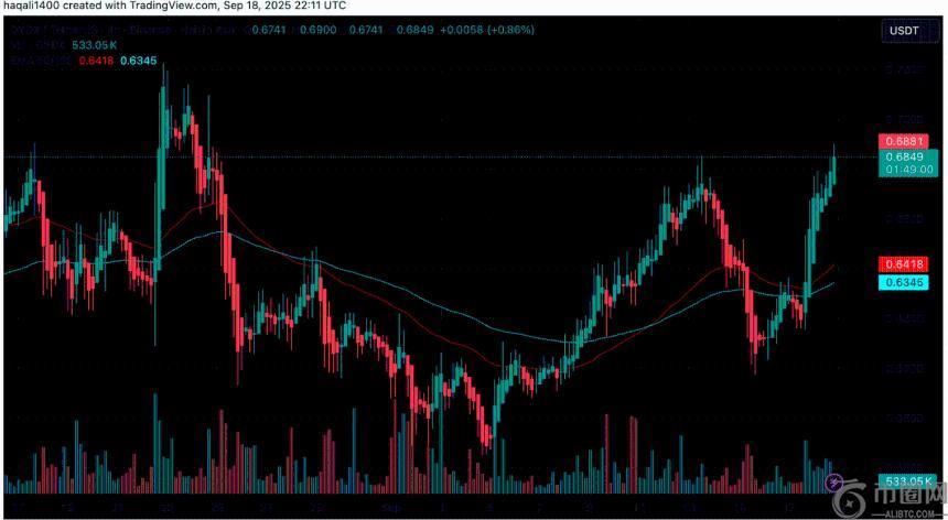 从9月中旬约0.60美元的低点开始,该代币已回升至0.68美元的阻力区上方,这得益于交易量的上升,表明买家活动更加活跃。