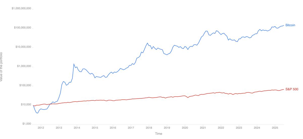 过去十年,比特币的表现远远超过标准普尔 500 指数。