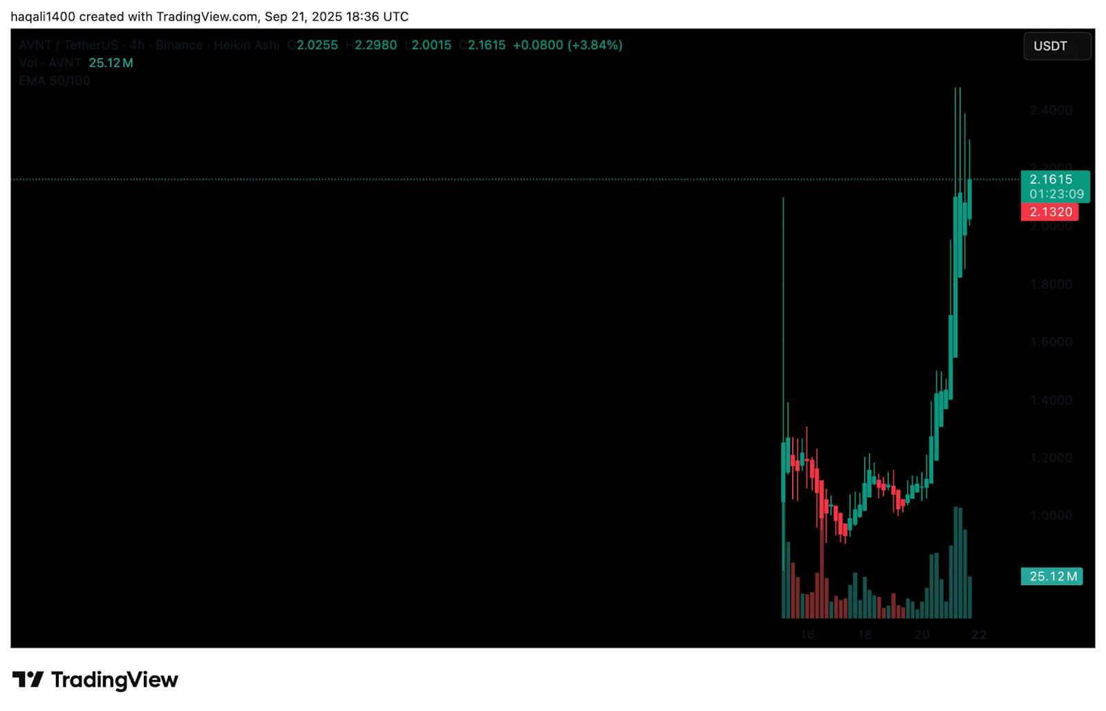 此次上涨距离其备受瞩目的发布还不到两周。Base 上的衍生品协议 Avantis 于 9 月初推出了 AVNT 代币,先是在 Coinbase 上线,随后又在币安上线。