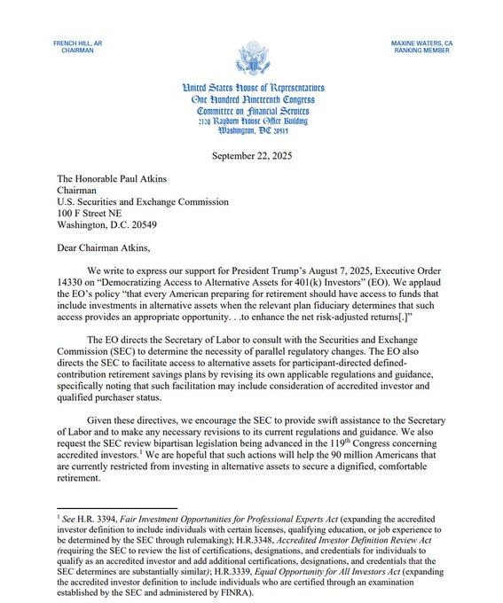 2025年9月22日,一封由美国众议院金融服务委员会发出的信函,打破了华盛顿与加密世界之间微妙的平静。信函由委员会主席、共和党人French Hill与资深成员、民主党人Maxine Waters联名签署——这本身就是一个值得玩味的信号。一位是加密货币的坚定支持者,另一位则是长期以来持审慎乃至批判态度的监管鹰派。他们的共同目标只有一个:敦促美国证券交易委员会(SEC)主席Paul Atkins,尽快执行特朗普总统于8月7日签署的第14330号行政命令。