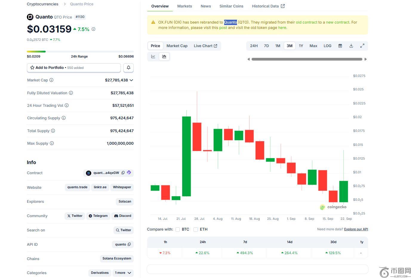 关于 Quanto 团队是连续操纵者的传闻已经浮出水面,以至于 Solana 联合创始人 Anatoly Yakovenko已删除一篇X帖子似乎支持了该项目。此事引发了市场暴跌,QTO美元汇率从0.075美元暴跌至当前水平。