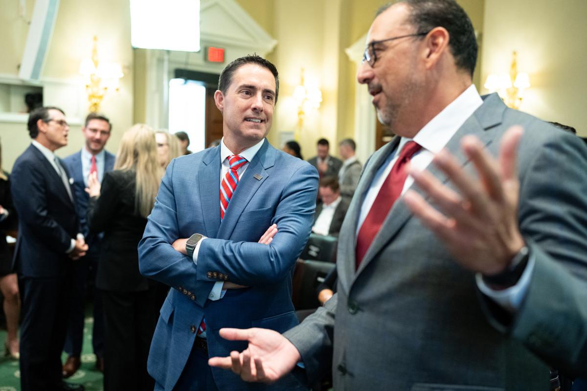 俄亥俄州州务卿弗兰克·拉罗斯(左)在众议院行政委员会关于“美国选举信心”的听证会开始前与亚利桑那州州务卿阿德里安·丰特斯交谈