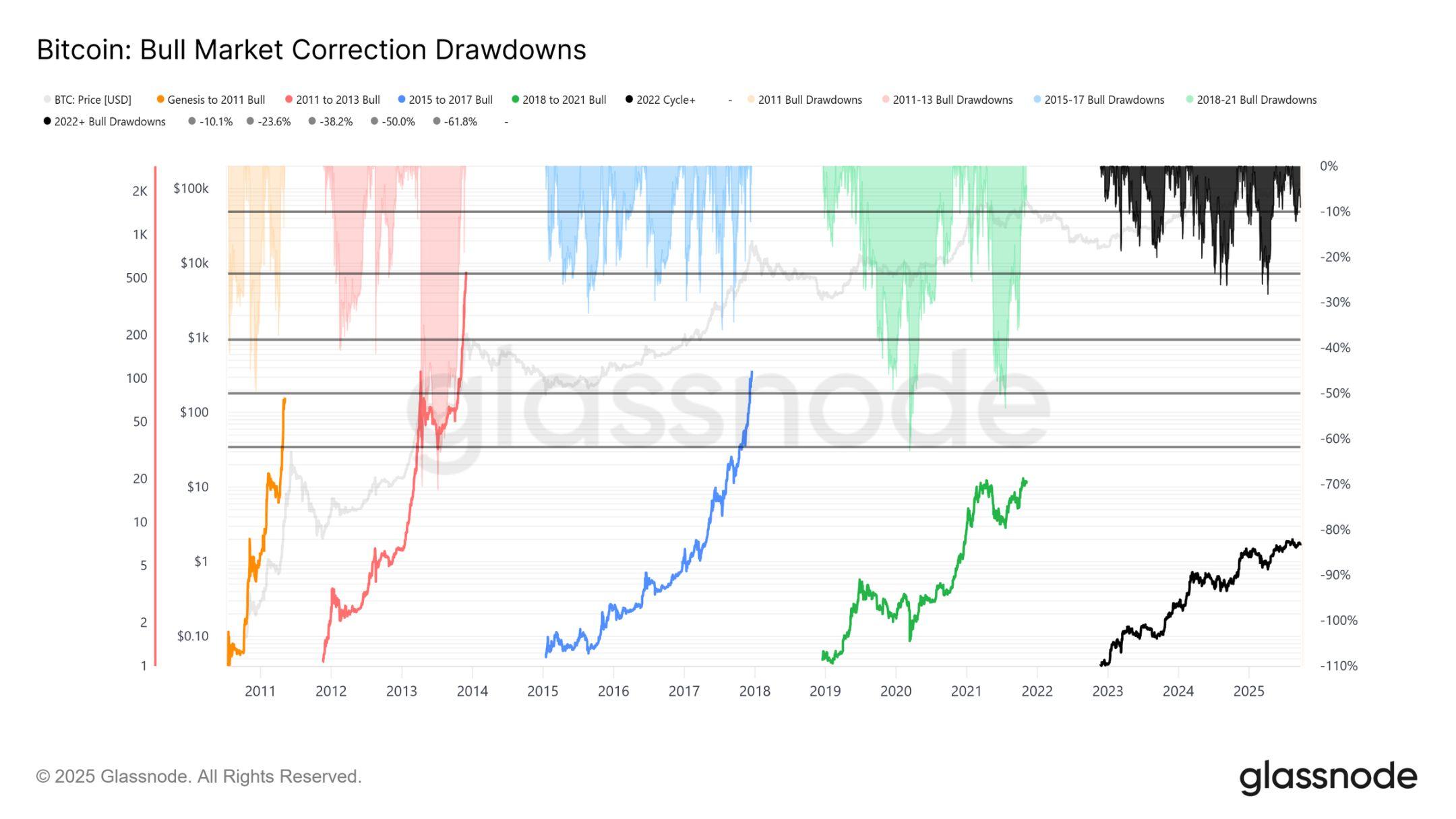 当前从 12.4 万美元的历史高点(ATH)回落至 11.37 万美元的跌幅仅为 8%(最新跌幅已达 12%),与本周期的 28% 跌幅或之前周期的 60% 跌幅相比显得温和。这与波动性减弱的长期趋势一致,无论是在宏观周期之间还是周期内的阶段内,都类似于 2015-2017 年的稳步推进,只是目前尚未出现其末期的暴涨行情。