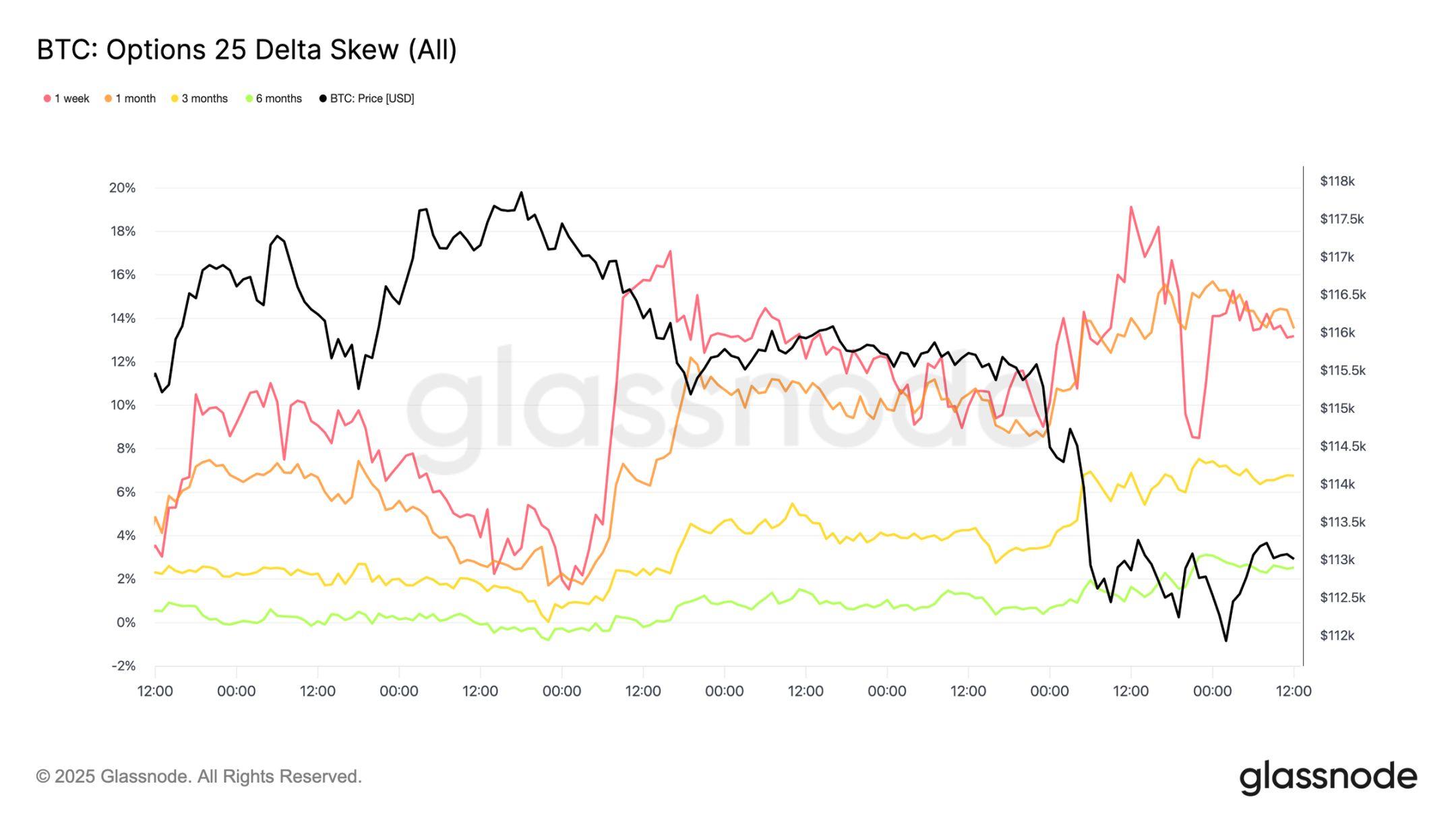 期权市场重新定价激进,偏斜度飙升,看跌期权需求旺盛,表明防御性头寸布局,宏观背景表明市场日益疲惫。