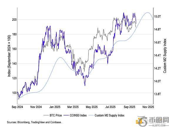 从更全球化的视角来看,Coinbase定制的M2流动性指数显示,流动性逆风可能从11月开始显现。我们优化后的全球M2流动性指数(该指数通过货币供应量增长与比特币价格的相关性进行调整,全球M2供应量领先比特币约110天)预计将在11月迎来向下拐点。由于该指数在1个月至3年的时间范围内与比特币的相关性约为0.9,我们认为这一拐点可能预示着年底将面临流动性压力(图1)。不过,该指数也显示10月份流动性状况较为宽松,这可能在短期内为风险资产提供一定支撑。