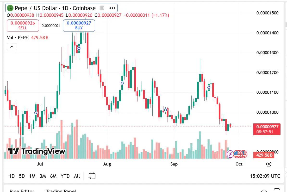 Pepe Coin 的价格为 0.00000926 美元,日涨幅为 1.28%,市值