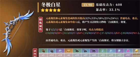 第二个推荐的武器是冬极白星,在满级的情况下基础攻击力为六百。装备后即可提高百分之二十四的元素战技与爆发伤害。当玩家使用普攻、重击等命中敌人后,还会拥有攻击力的增益加成,持续时间为十二秒钟。虽然该武器是别的角色的专武,但是技能特效也完美的符合甘雨。在精炼一阶的情况下,就能够让角色吃到百分之三十的攻击加成,中间衔接普攻还能触发百分之四十八的攻击加成。该武器比较适合选择融化流阵容的甘雨,理想上造成更高的伤害。目前融化流的常见搭配是香菱、班尼特加上甘雨,前两者都需要贴脸释放攻击,配合武器恰好可让甘雨触发近战加成效果。