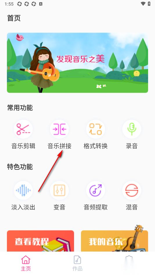 1.直接进入到音乐剪辑精灵APP这款软件中,在页面上找到显示的【音乐拼接】功能,将其点击打开。